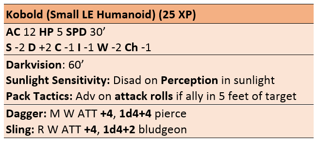 Just a minor nitpick, but you missed the part about the kobold’s Sunlight Sensitivity that it also has Disad on attack rolls.