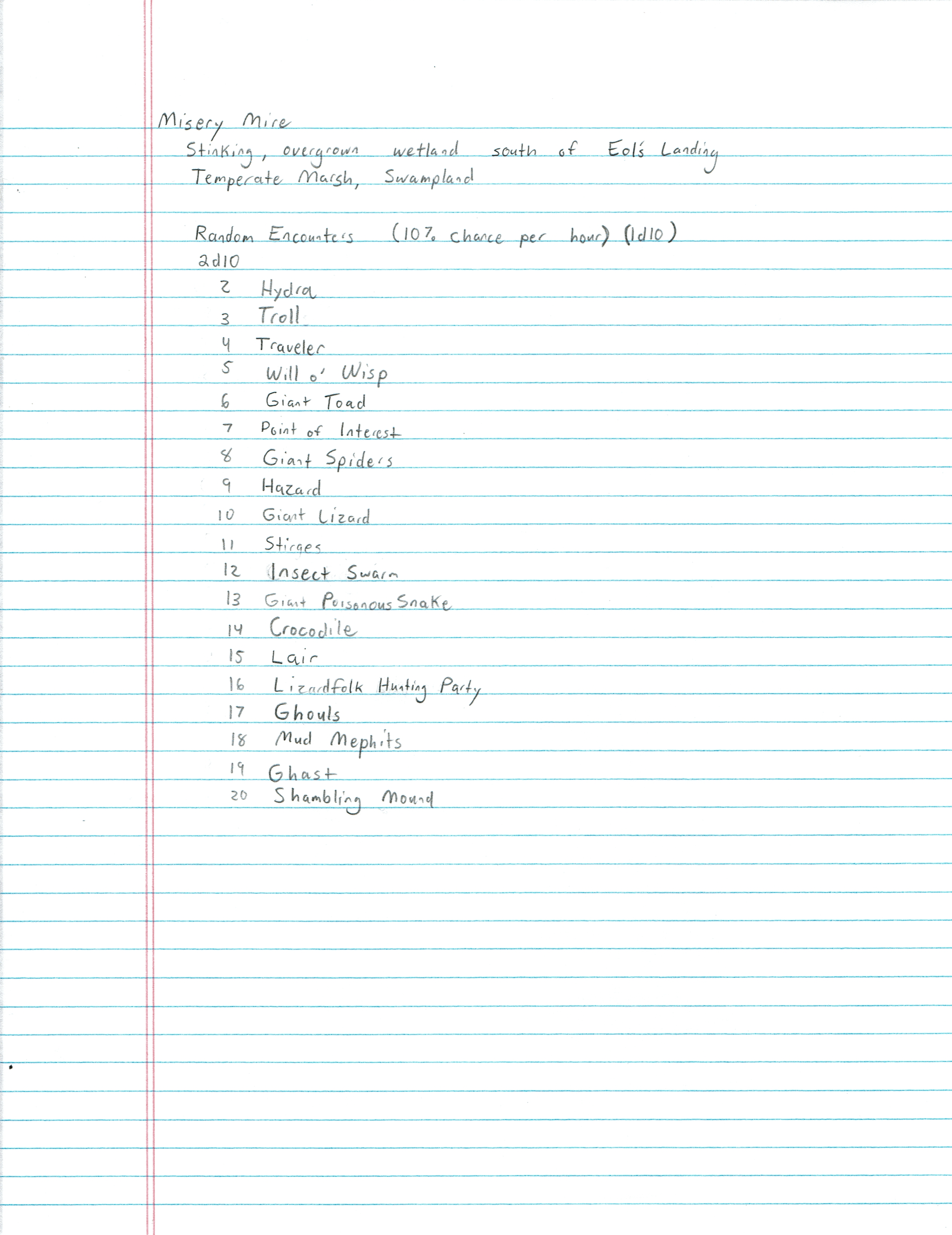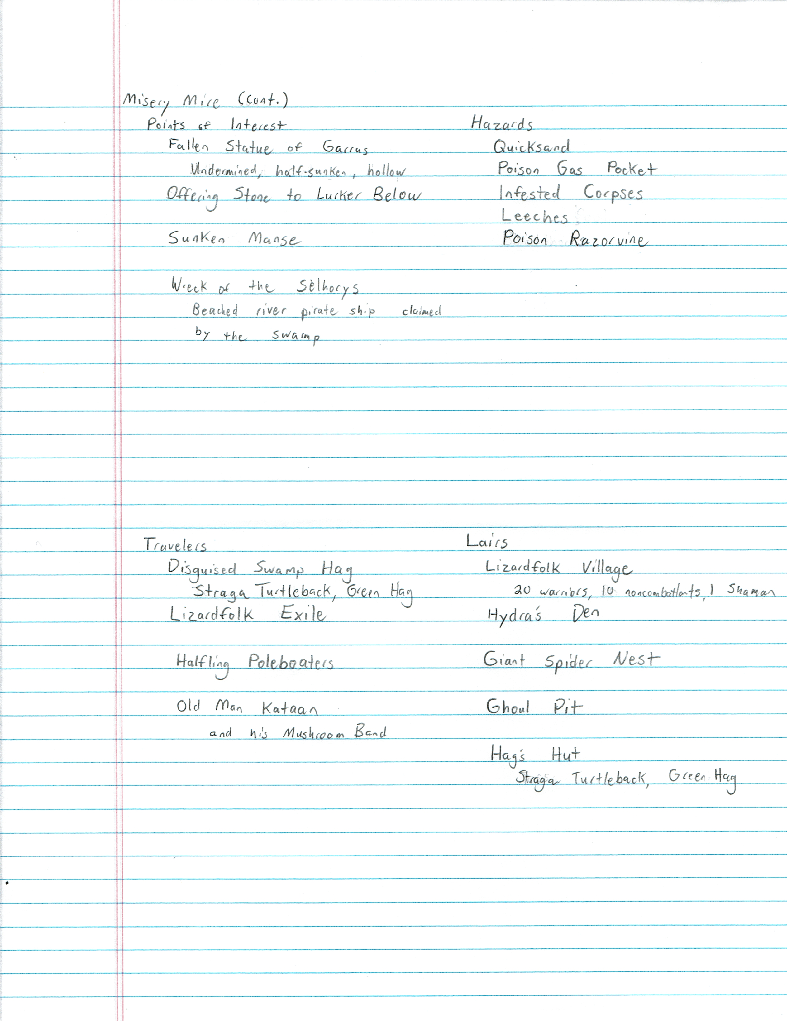Note that the lists are pretty thin on details? Note the space I left so I could add more elements to the lists or add more details as I ‘discovered’ them? Note how I basically just shortlisted a bunch of crap from the Monster Manual and s$&% out some evocative names and random gibberish? Yep. That’s the fine art of populating an open world right there.