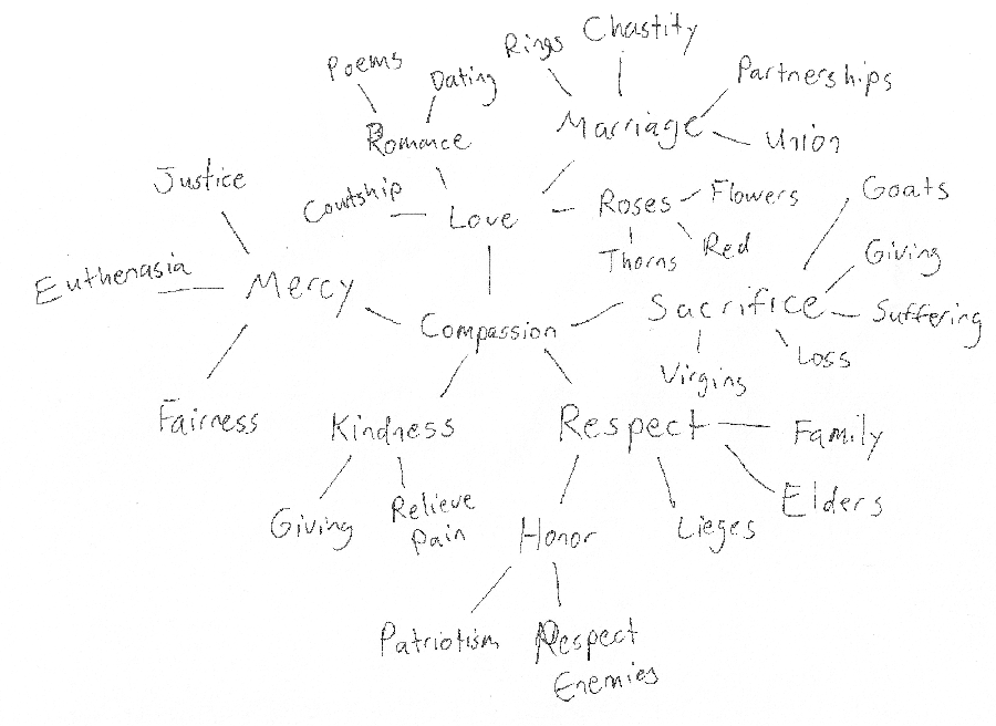 Okay, first of all, if you want to write a catchy sort of anything – poem, code, chant, riddle, dirty limerick – you need to summarize your key points. Grab a piece of paper and decide what the five virtues or seven virtues or three virtues of a paladin are. Like, Courage, Truth, and Compassion. Whatever. Now, take those three words and play a little bit of word association. Write each word in the middle of a piece of paper and start adding words around the word. Then add words around those words. For example, if I were doing compassion, it might look like this: