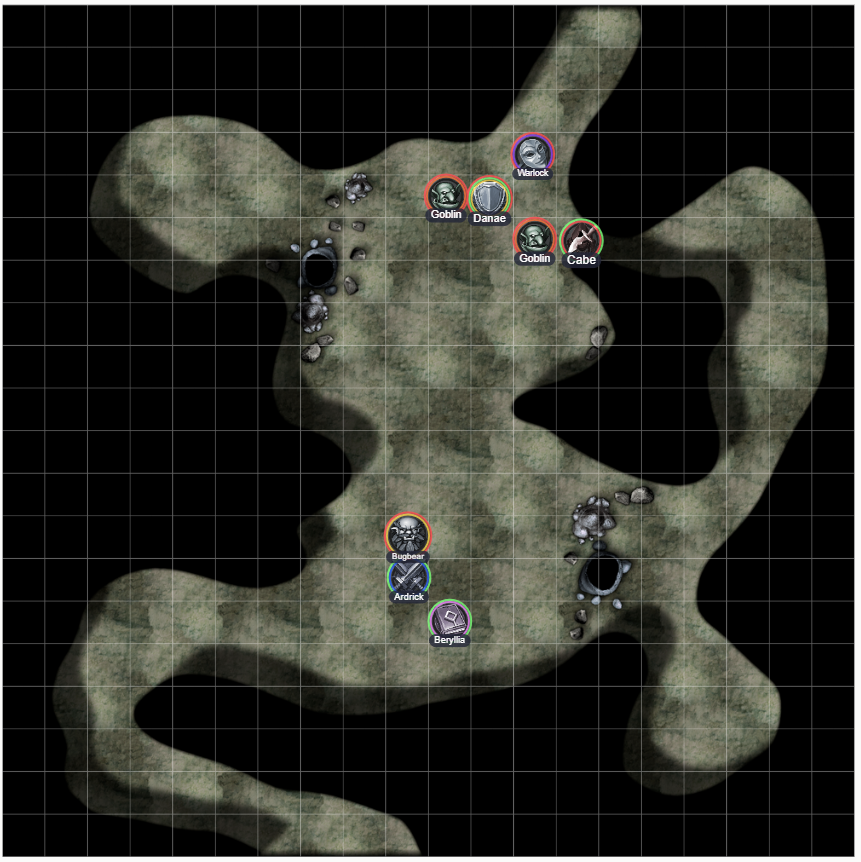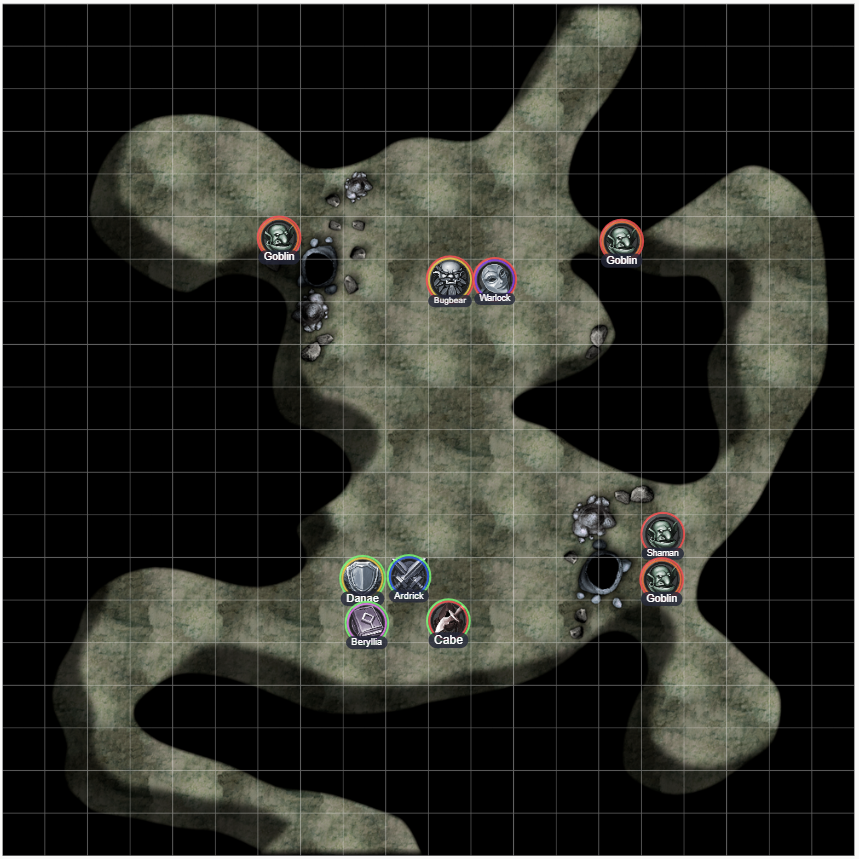 The party’s tromping along, arguing as they do, when they come around a blind curve into a cavern. The warlock’s there with his bugbear buddy, a goblin shaman, and a few goblin skirmishers. Since he hears the party coming, he tells his goblins to hide in the side passages, hidden by stalagmites and columns, while he sizes up the opposition and decides what to do.
