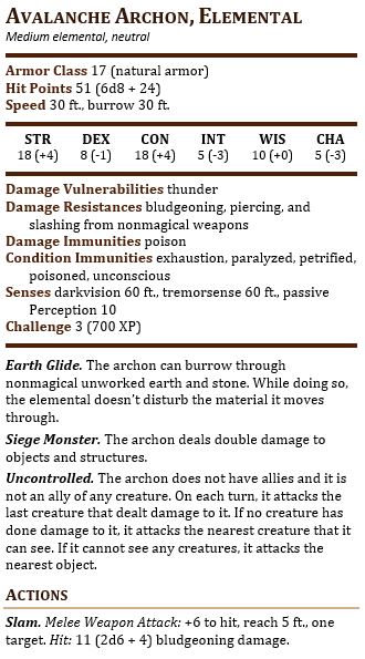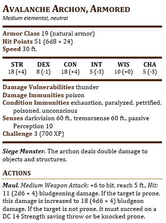 I have some solutions for my problem, like, as before, just doubling their hp if they have a crappy resistance. Or, if I was using the Avalanche Archon against my group, I’d keep HP the same, remove the resistance, and budget it more into his offensive ability (since that it has 2 less AC it’s effectively 1 CR less in its defensive CR). Simply because, I’d want the fight to feel more like an out of control elemental that they may want to choose to use more of their resources to burst down before it becomes a problem.