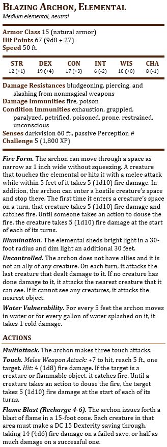 And this is a little advancement thing. The thing is, if you were running a campaign based around elementals (or elemental EVIL… *wink*), you might use archons a few times. The first time the party encounters the archon, they are probably low to mid level and the archon is a boss by itself. They probably never even notice the uncontrolled fury thing. But as they get to higher levels and encounter archons with other creatures, the uncontrolled fury becomes a tool they can use. It’s the sort of thing that rewards multiple encounters at multiple levels.