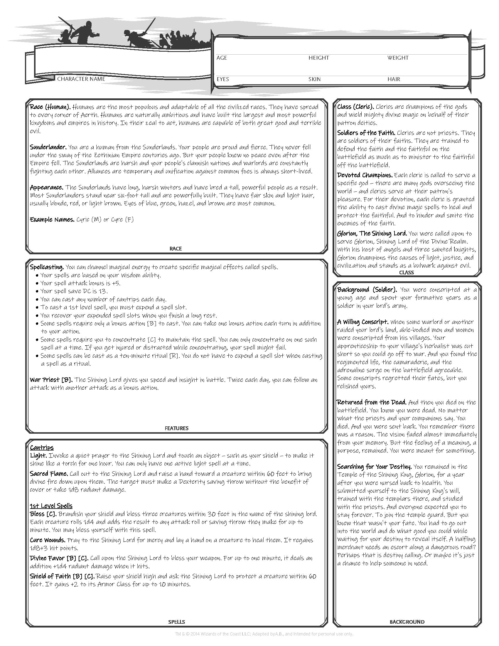See? Everything the cleric might do during play can be fully resolved just by looking at the front of the sheet. Even the spells and class features. And notice how the stuff is mostly where you’d find it on a real sheet. Mostly. And notice how everything can be tracked right on the sheet whether you’re using a printout or a PDF. There’s check bubbles for hit dice and spell slots and a fillable form for hit points and for the character’s name and other details.