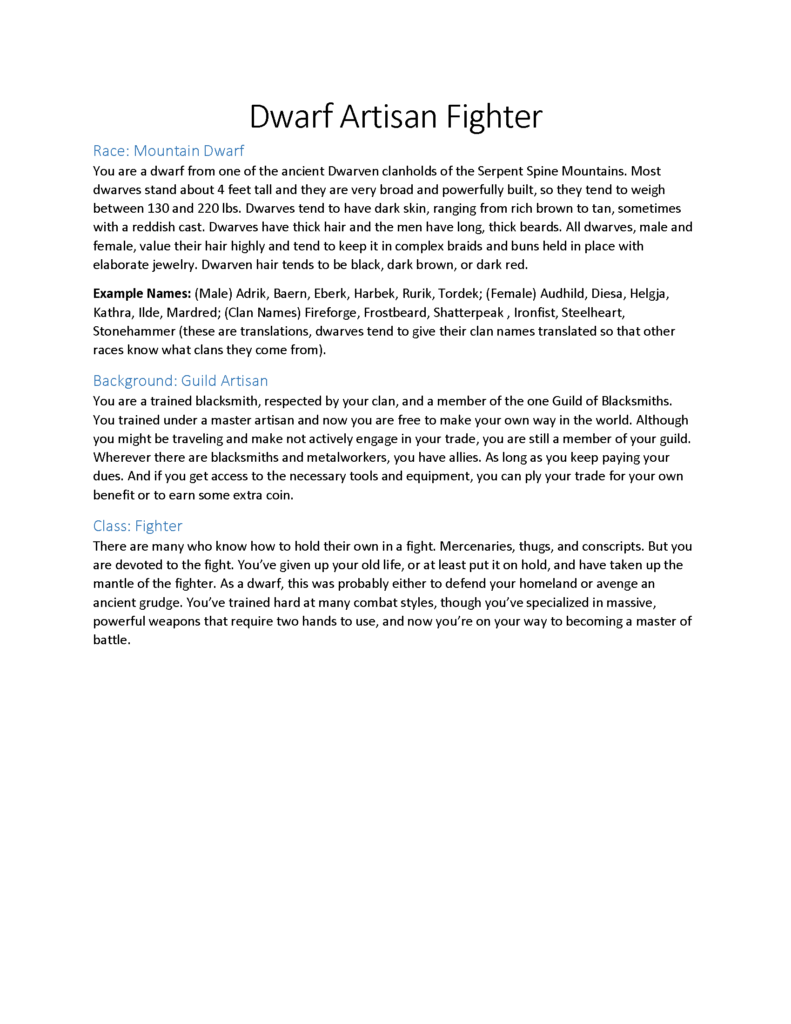 Third, while I wanted to dump useless, extraneous crap in the trash, I didn’t want to dump flavor. These character sheets might well be the first tangible thing these players ever see of D&D or RPGs in general. If they have the souls of tax forms, they’re not going to sell anyone on the experience. So I didn’t want to skimp on the background and world lore. Even if the details were just simple little stories the players could use or ignore as they wished.
