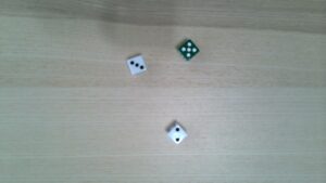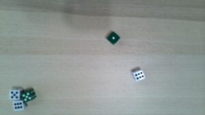 One low roll means one inferior item. Two high rolls mean two superior items. I’ve got lots of colored d6s, so I replace the inferior Item Die with a red d6 and the superior Item Dice with green d6s.
