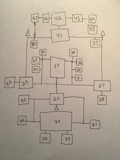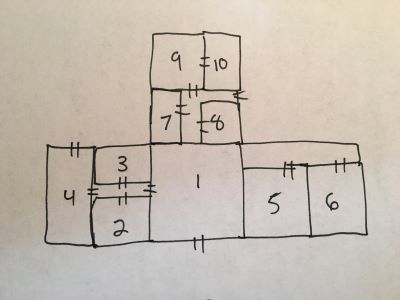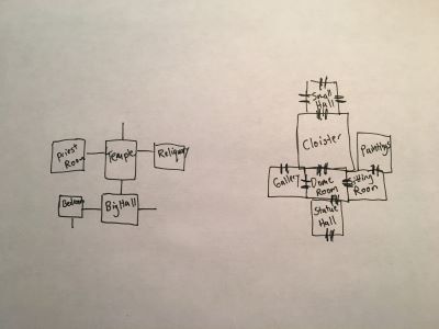 First, let’s throw out the notion that it is in any way necessary for the party to produce a map of the same quality as one of Pathfinder’s in house cartographers. That s$&% is useless and pointless and it sets the bar way too high. Instead, let’s agree that the best way to map is the way that those of us who ever played a game Zork already knew – one of the old Zork games before graphics were invented that is. All the party needs is a flowchart. A room is just a box with a name in it. A connection between rooms is just a hash mark on the wall between the rooms. A hallway is just a line. That’s it. Quick and dirty.