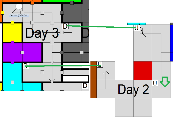 So, there is no way into Day 18 that doesn’t go through a purple door, even if it is coming from a brown or gray region. No matter what direction you come in from – no matter what direction the plot is going – it shouldn’t be possible to get into that space without going through a high-security door. Hence, I surrounded the entire area with purple doors, even if I had to set some of them back a little way in other regions.