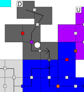 Recall that the progression is that the party will unlock purple rooms first – those require the Runeforged Frostkey or whatever the hell I called it. Then, they unlock the brown rooms which require them to be able to fly. Then, they can access the dark gray rooms after they eliminate the corrupting spirit and remove the miasma of necromantic death magic. So, there’s no reason for purple exits between purple, brown, and dark gray rooms. At least, not from a gating perspective. For example, once the party can fly, they can use the southern brown door to reach the brown region that is Day 20. There’s no reason for a purple door immediately beyond. And once the corrupting spirit is dead and the party can enter the dark gray, optional area to the east, there’s no need for purple doors beyond. Right?