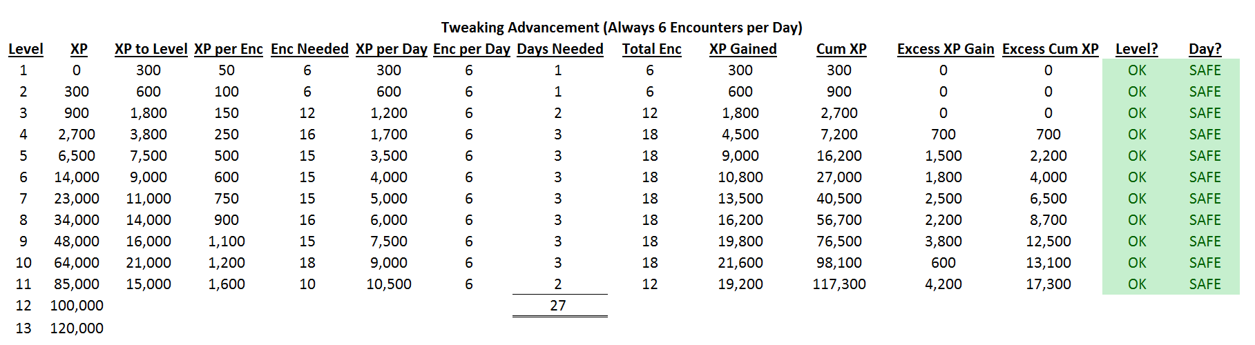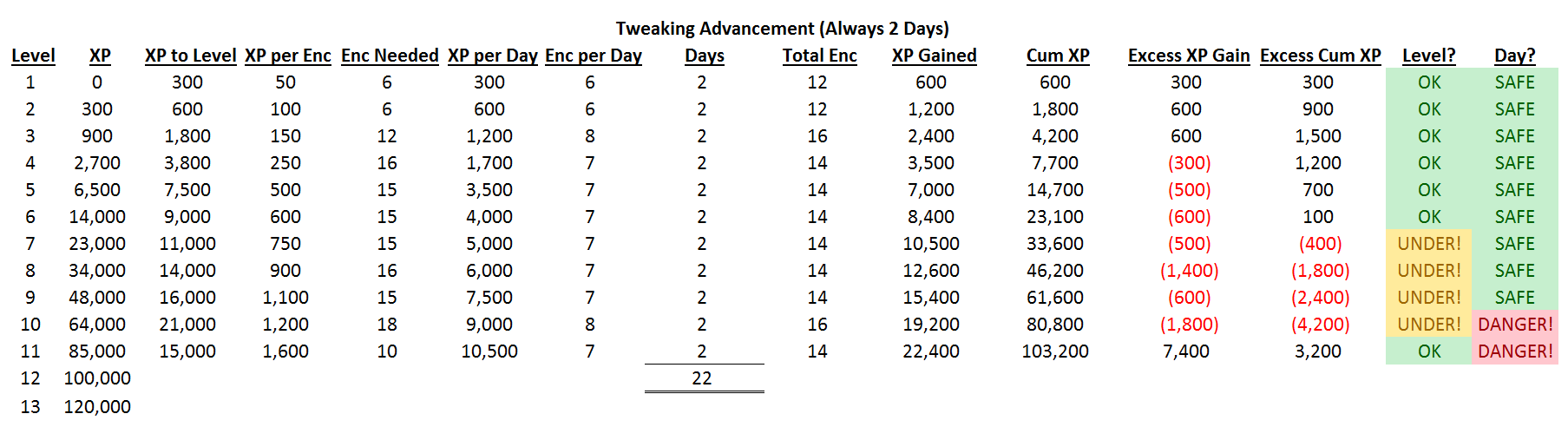 So, we start to fiddle again. And I won’t go through that step by step. Suffice to say that by fiddling with the number of days and the number of encounters at each level, I eventually find a progression that I like. And one that really nails down the idea of being just about exactly 11th level AT the start of 11th level. That is, at the end of 10th level, a PC is only 800 XP over the requirement for 11th level.