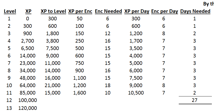 Now, if we divide Enc Needed to level by Enc per Day, we can find out how many days of adventure the PCs should spend at a given level.