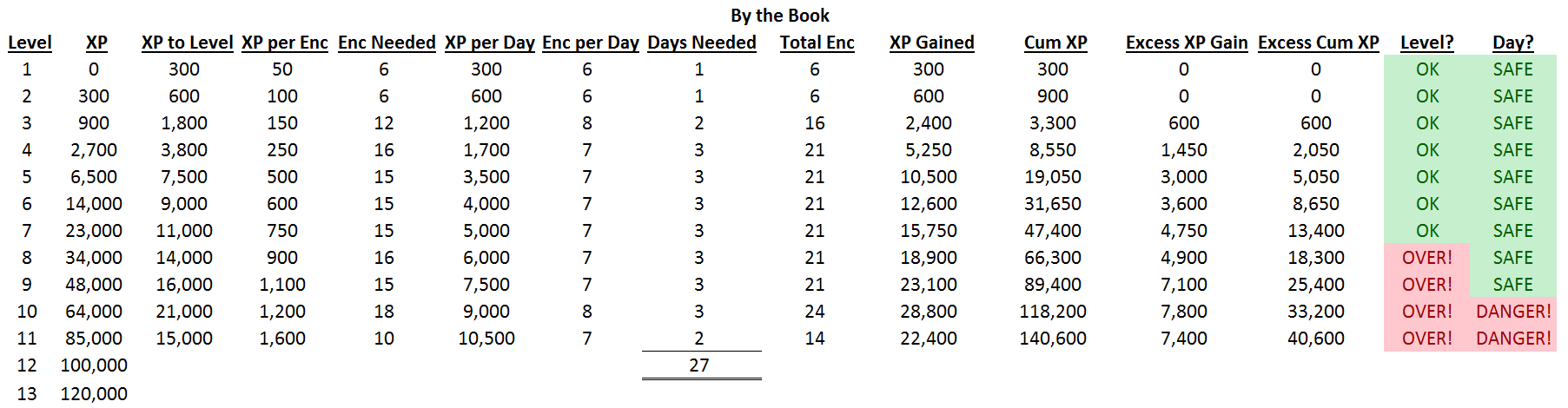 By the BookI added a few columns. First, how much Excess XP is gained over what is needed. At 4th Level, for example, you need to gain 3,800 XP, but you’ll actually gain (based on the encounters and days we calculated) 5,250 XP, which means you have an excess of 1,450 XP. I also keep a running total of the Excess Cumulative XP.