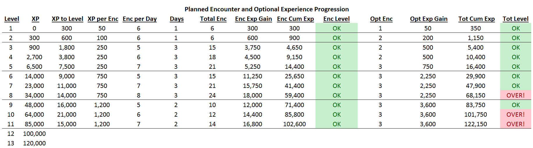 And then, to make things easy to visualize, I added two columns. The first column tests whether your level has gone too high. For example, at the end of your 8th Level adventures, you have 66,300 XP, which actually brings you to 10th Level. Your level has gone up too fast.