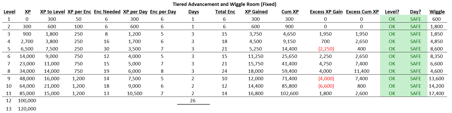Anyway, let’s assume that progression (the Tiered Advancement and Wiggle Room (Fixed)) is the one I’m going to start with. It certain seems to do everything I want it to. So, now, let’s figure out how much optional XP the adventure can tolerate.
