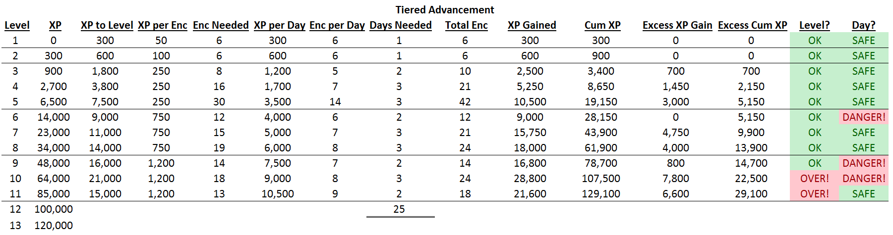 TieredInteresting. Notice, we get a pretty good advancement. We don’t really underlevel. We start to overlevel around 10th level. But we do have a bunch of days that push the PCs just a little too hard. Also, the days at 5th Level are awfully long. 14 encounters a piece? That’s too much.