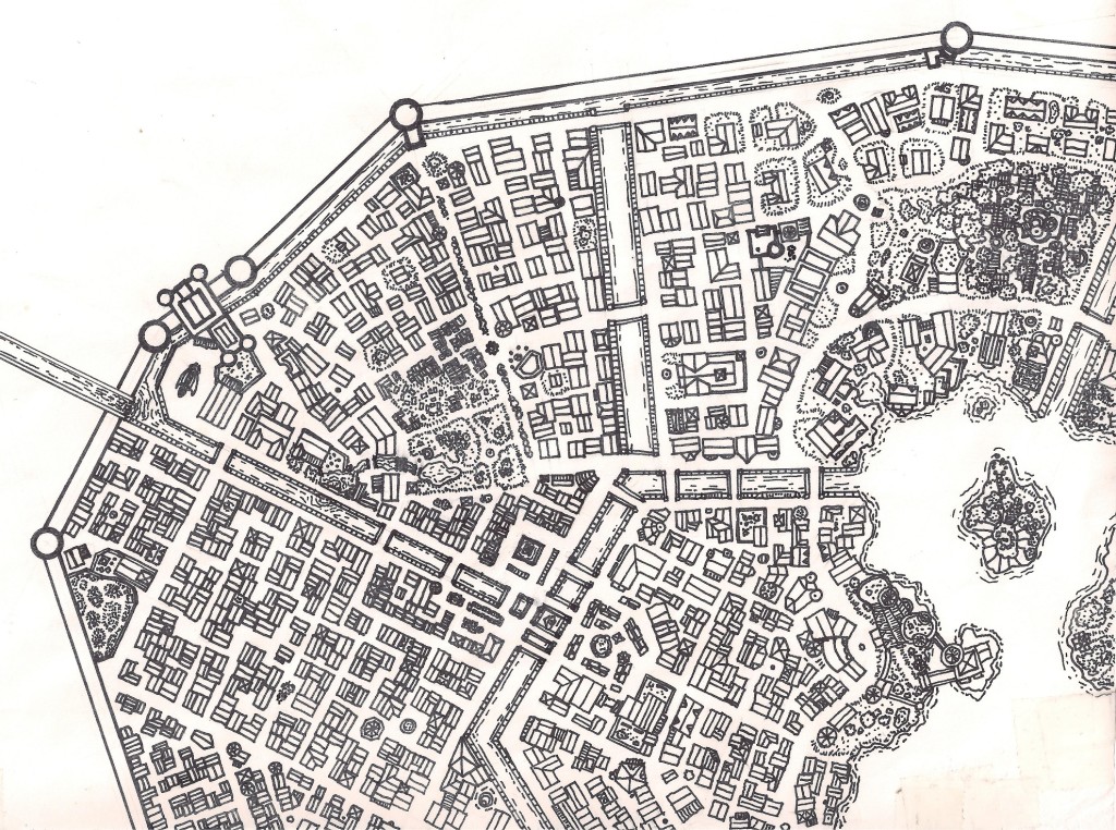 The Big City Map project is a project that I started working on years ago. It started when I ran a campaign set in a giant city-state ruled by some powerful factions that included seven mage guilds and a host of other, less powerful guilds and organizations. The city had fallen into chaos when the founder of the city up and vanished one day. She had been keeping the factions and guilds in check for the century and half that she’d been ruling the city. She was an archmagus and had lived a long time and was pretty much the most powerful wizard in the world at the time. And her disappearance created a power vacuum and political chaos. It was a pretty cool campaign.