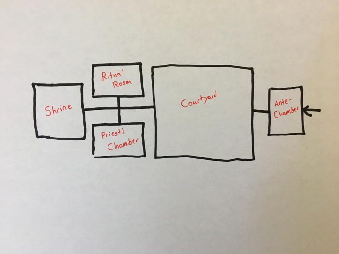 That said, they aren’t completely useless. Just as with the rest of the artwork in the module or other product, Artistic Maps do help establish the tone of the place. Here, look. I slapped together an Artistic Map of that same temple I used above. Check it out.