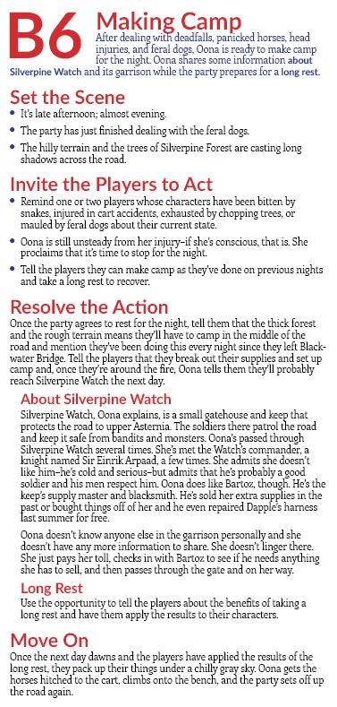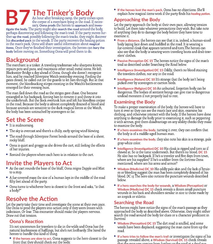 Both of the encounters you’re going to see come from the tutorial segment of the adventure. They teach specific game concepts. B6 is probably the simplest encounter in the entire module. The players are encouraged to take a long rest, the GM tells them how long rests work, and then an NPC imparts some useful information to foreshadow upcoming events. B7 is likely the most complex encounter in the entire module. It’s the first open-ended encounter the players face. They’re presented with a scene to investigate instead of an urgent problem and they have to ask questions and look for clues. Because it’s an investigative scene, the GM needs a bunch of background information close at hand.