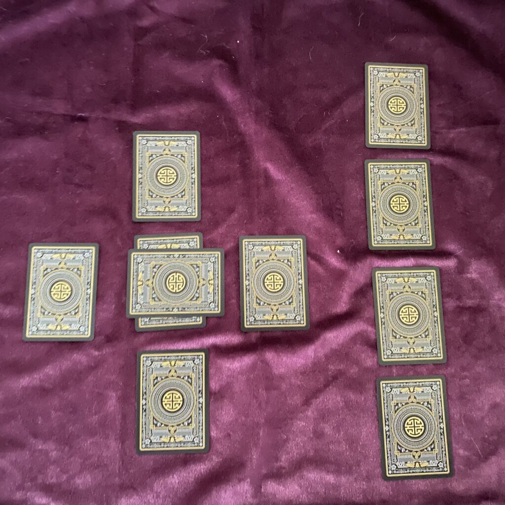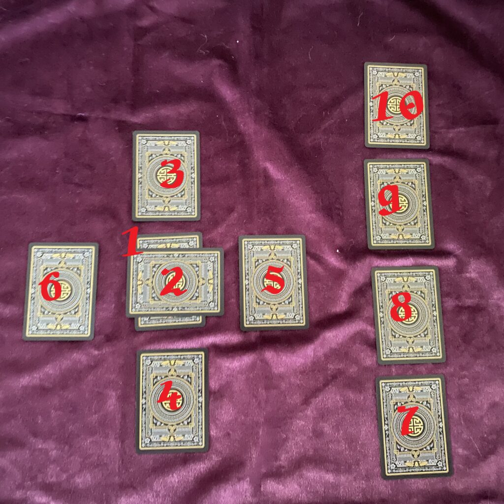 How does it work? The Querent chooses ten cards at random from the Tarot deck. The Reader lays each into its proper position as its drawn. And then interprets each in turn. Usually, the Reader will lay the cards out face down and then reveal them one at a time, in order, and talk through the emerging interpretation. Going back and recontextualizing and reinterpreting as necessary.
