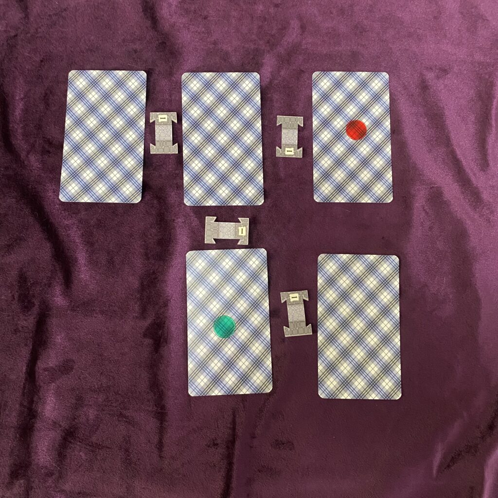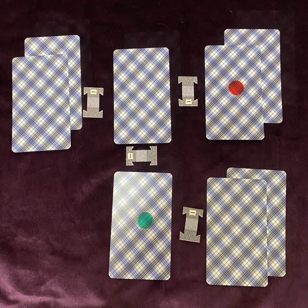 Next, grab some little token doodads you can use for doors or passages. Connections. Because each card in the Spread’s a room or encounter space. And you need to link them with doors or halls or whatever.