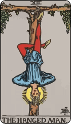 The Hanged Man. What a card. Kind of a Prometheus figure. Obviously, the Hanged Man’s in a position of suffering. He’s made a sacrifice or he’s being punished. But he’s at peace. Look at his face. And he’s got a shining light around his head. And his being upside-down suggests a change of perspective. So this is all about wisdom and perspective through suffering and sacrifice. Making a choice and accepting the price.