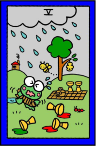 There’s a lot more variation here. But, thematically, there’s a lot of similarities too. Rider is mourning a pile of spilled cups. Alone. Under a dark sky. Psyche’s being left alone. In the dark. By an angelic figure. There’s a bed there. And spilled cups. Keropippi — yes, I know my Sanrio characters; don’t judge — Keropippi is crying because his picnic’s ruined. Dark clouds, rain, ants, bees. And he’s spilled his cups.