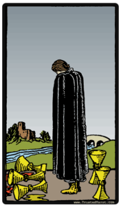 On the right’s one of my favorite cards from the Minor Arcana — don’t read into that and don’t ask me why it’s one of my favorites, that’s my stupid unconscious brain at work — on the right’s a card from the Minor Arcana. The Five of Cups.