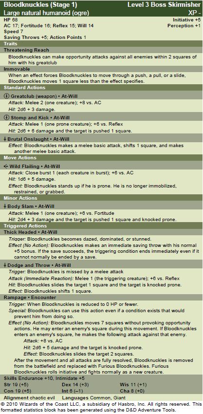 Some of you might recognize Bloodknuckles’ name from Dungeons and Dragons Online: Eberron (DDO). This is no accident. When I was first thinking about boss monsters, I was also working on a fun little adaptation of several quests from that game for 4th Edition. Specifically, I was working on a three adventure series that would incorporate the first two quests from the “Waterworks” quest line and “The Kobold’s New Ringleader.” The latter ends with the party slaying a kobold chieftain but, before they can celebrate, a brutish ogre enforcer smashes his way through a door to slay the party. His name was Bloodknuckles.