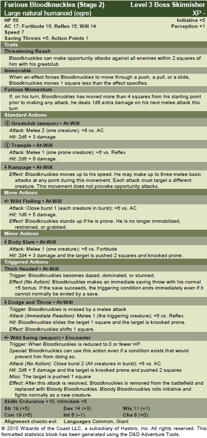 The addition of Furious Momentum is a tactical incentive. It requires Bloodknuckles to move around before attacking each round, forcing him to spread his attacks out and chase people all over the battlefield. A DM who doesn’t take advantage of it is leaving damage on the table. This is actually an important trick in monster design in general if you intend anyone other than you to run the monster. Just as an Avenger has powers that create an incentive to isolate a certain creature, monsters can have powers that give the DM an incentive to adopt certain tactics. While Bloodknuckles’ powers haven’t changed a great deal in stage 2, his tactics have, and this trait emphasizes it.