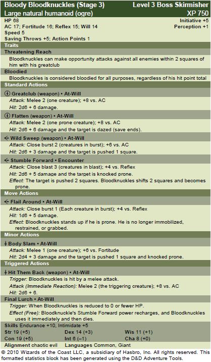 I calculated the HP normally for Bloodknuckles and simply divided it by three to determine how many HP each stage should have. Based on some quick estimates of average damage output and accuracy, Bloodknuckles should spend two to three rounds in each stage against a 3rd-level party. That seems about perfect. Bloodknuckles does not become bloodied like a normal monster. Instead, his third stage is considered bloodied. He simply goes from full to dead.