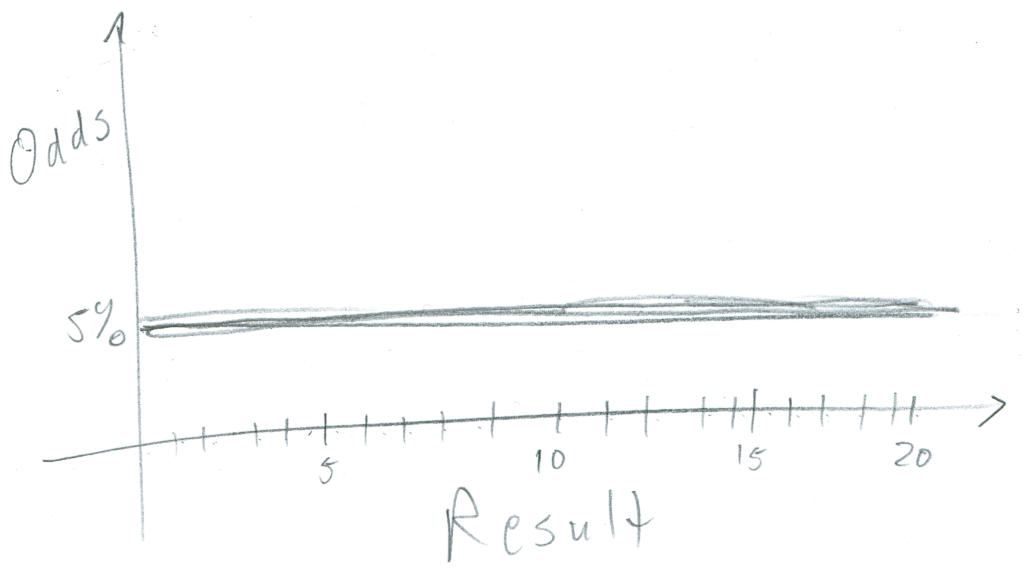 So, the d20 yields a linear probability curve. If you graphed the odds of each outcome, it’d look like this…