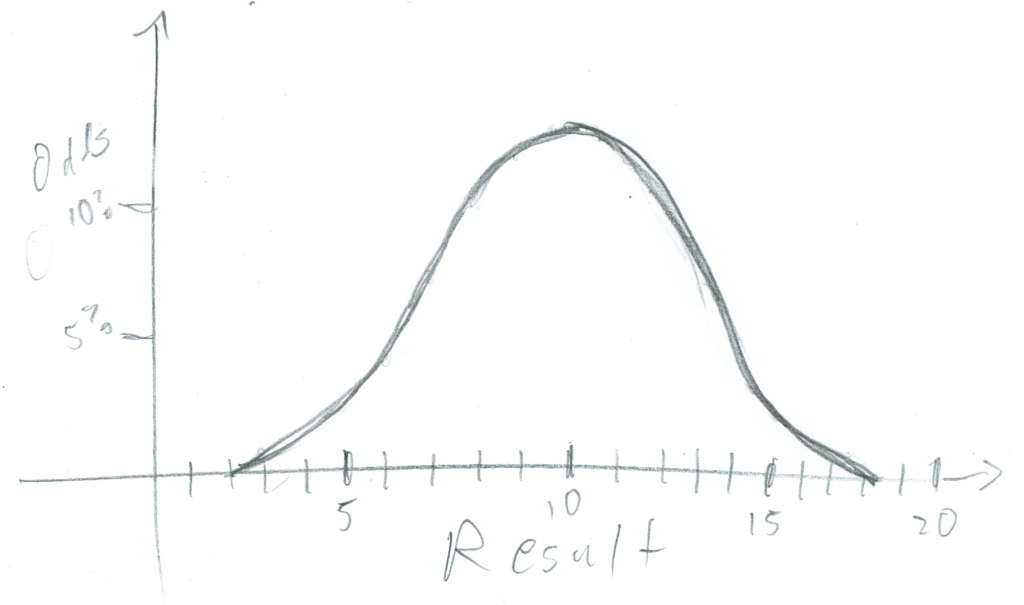 And gamers call that a bell curve or normal distribution whereas actual math wonks wouldn’t even graph the results like that because, again, dice generate discrete results… blah blah blah math is hard.