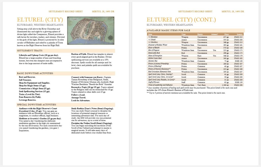 This is actually pretty close (although way better) to what I was already doing with my cities, at least the location-activities relation. One major difference is that I wasn’t planning on showing it to the players, while it seems to me, especially reading the “Special Downtime Activities” list, that your idea is to give it, or at least read it, to them whenever they enter the city, right?
