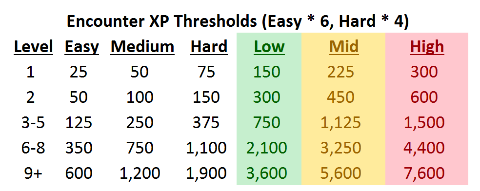 I was looking at your table of Encounter XP threshold and found that you are tiering the encounters unlike me. I looked upon the XP Threshold per Level and saw that there is some jumps in difficulty that match the Tiers of Play from DMG. For example, you grouped the levels 3, 4 and 5 but even on your table first Encounter XP Threshold you will see that Deadly encounters for level 4 are Easy Encounters for Level 5, so characters of level 5 will cakewalk this entire tier.